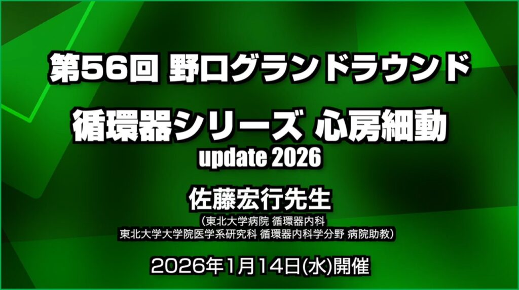 2026年1月14日(水)に第56回 野口グランドラウンドを実施し、「循環器シリーズ 心房細動 update 2026」をテーマにお話ししました。