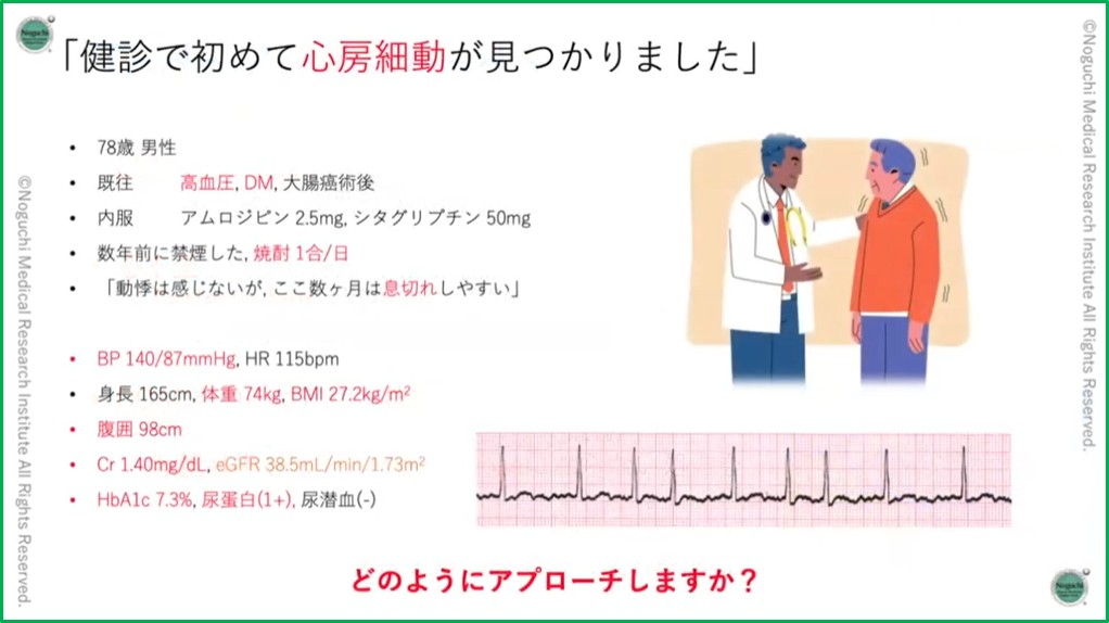 本講演では、心房細動に関する最新のトピックスやトータルマネジメントを中心に、明日からの診療にすぐに活かせる実践的な Tips を共有していただきました。