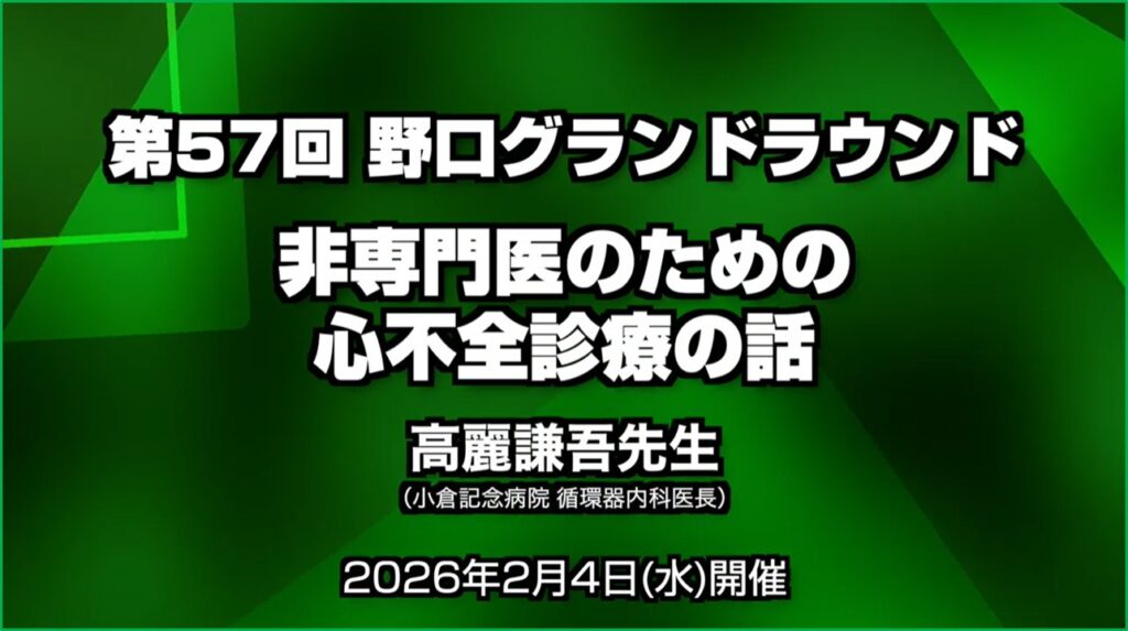 2026年2月4日(水)に第57回 野口グランドラウンドを実施し、「非専門医のための心不全診療の話」をテーマにお話ししました。