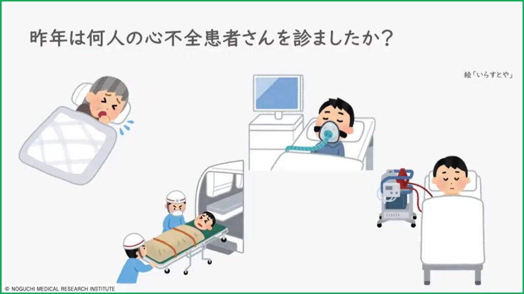 今回の講演では、「救急外来でどう心不全を疑うか?」「心不全と診断してどうするか?」「入院した後に気をつけたいことは何か?」「入院患者の心不全合併時の注意点はないか?」「外来では特に注意することはないか?」